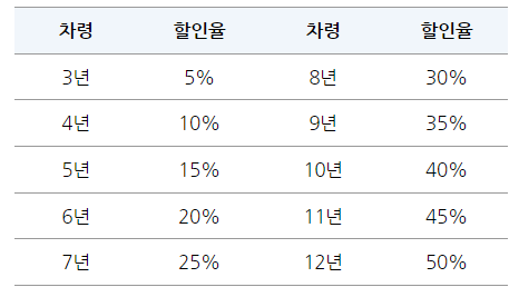 여기까지 이해되셨나요? 하지만 이것이 끝이 아닙니다. 차량 연식에 따라 할인이 적용되고 연식이 오래될수록 할인율이 증가합니다. 조금 더 구체적으로 말씀드리자면, 최초 할인이 적용되는 시기는 연식이 3년이 될 때부터이며 이후 매년 5%씩 할인율이 증가합니다. 아래 표를 참고하세요