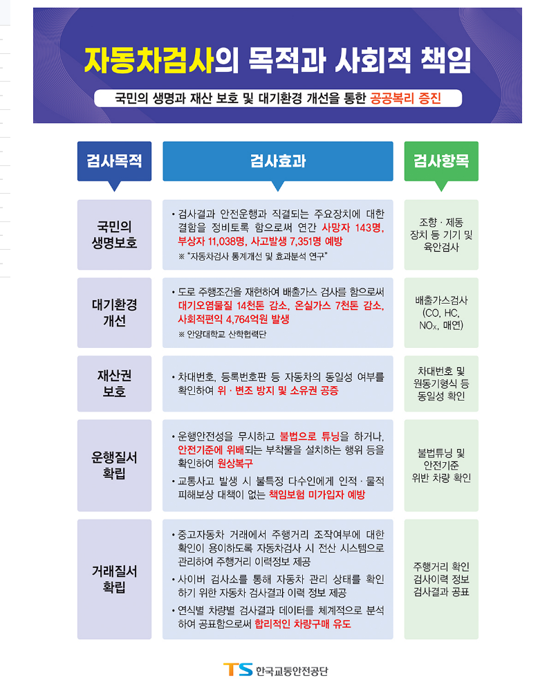 안전도 적합여부를 판별하여 교통사고 예방에 기여하고, 소음과 배출가스로부터 환경오염을 예방하는데 주 목적이 있으며, 자동차의 동일성을 확인해 국민의 재산권을 보호하고, 보험 가입여부, 불법 튜닝여부를 확인하여 주행 질서 확립에 기여합니다.