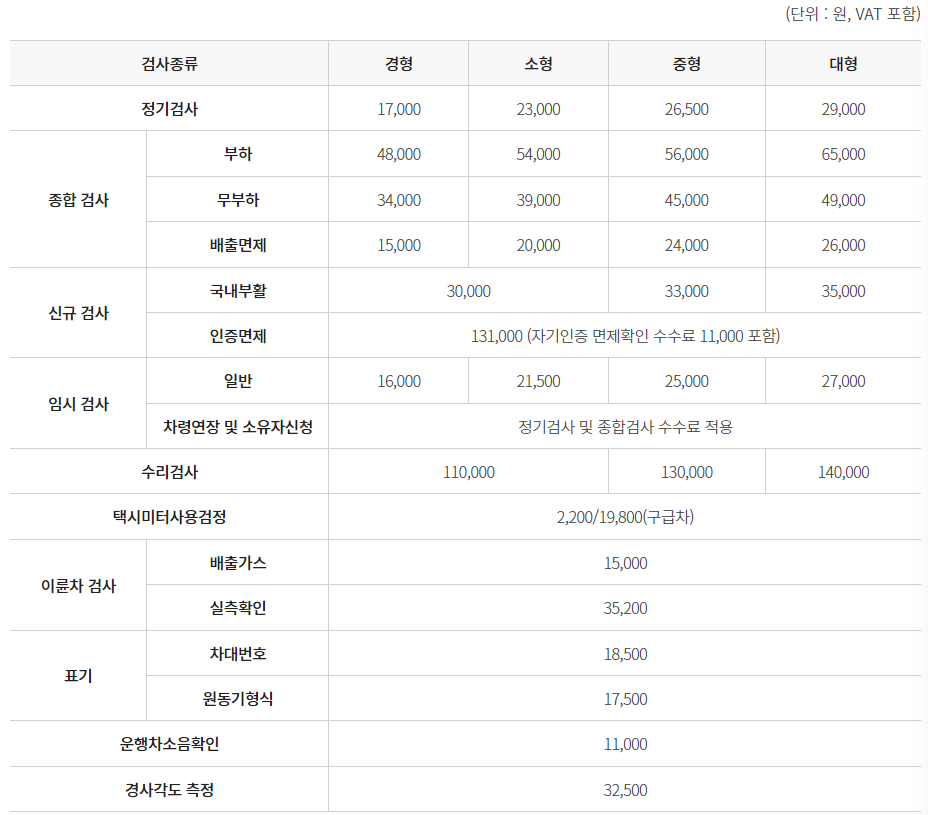 물론 자동차 검수는 무료로 진행되는것은아닙니다. 다음과 같은 수수료가 있으니 참고바랍니다.