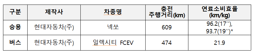 보급 차종은 크게 두 종류로 나뉩니다. 승용차 같은 경우는 현대자동차의 넥쏘이며, 버스는 현대자동차의 일렉시티 FCEV입니다.