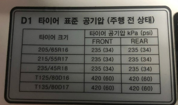 가장 정확한 적정 타이어 공기압은 여러분들 차에 적혀있습니다. 주유구 또는 운전석 앞문 부분을 살펴보시면 아래와 같이 표준 공기압이 적혀있습니다. 예를 들어 표준공기압이 36 psi라고 적혀있다고 가정해 볼게요.