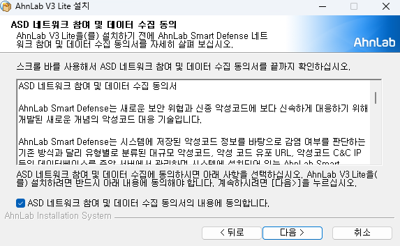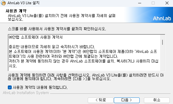 V3 설치방법은 어렵지 않습니다. setup파일을 실행후 아래 이미지와 같이 다음 버튼을 클릭하다다가 사용권 계약에 동의하라는 내용이 나오면 동의후 다음을 클릭합니다.