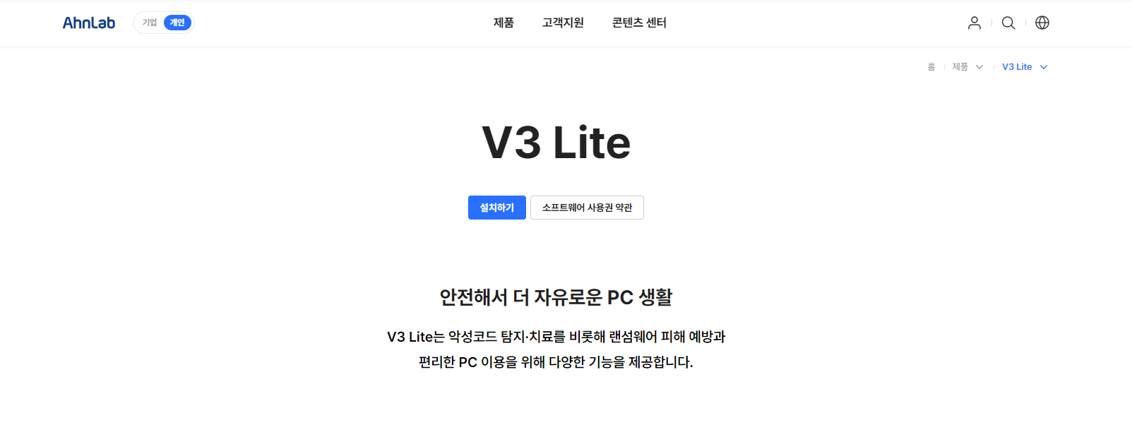 V3를 다운받기 위해서는 AhnLab 사이트를 방문하셔야겠지요. 안랩에서는 기업들을 대상으로 다양한 보안 솔류션을 판매하고 있지만 개인에게는 V3 Lite 버전을 무료로 제공하고 있습니다.